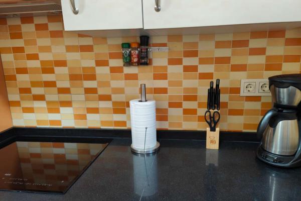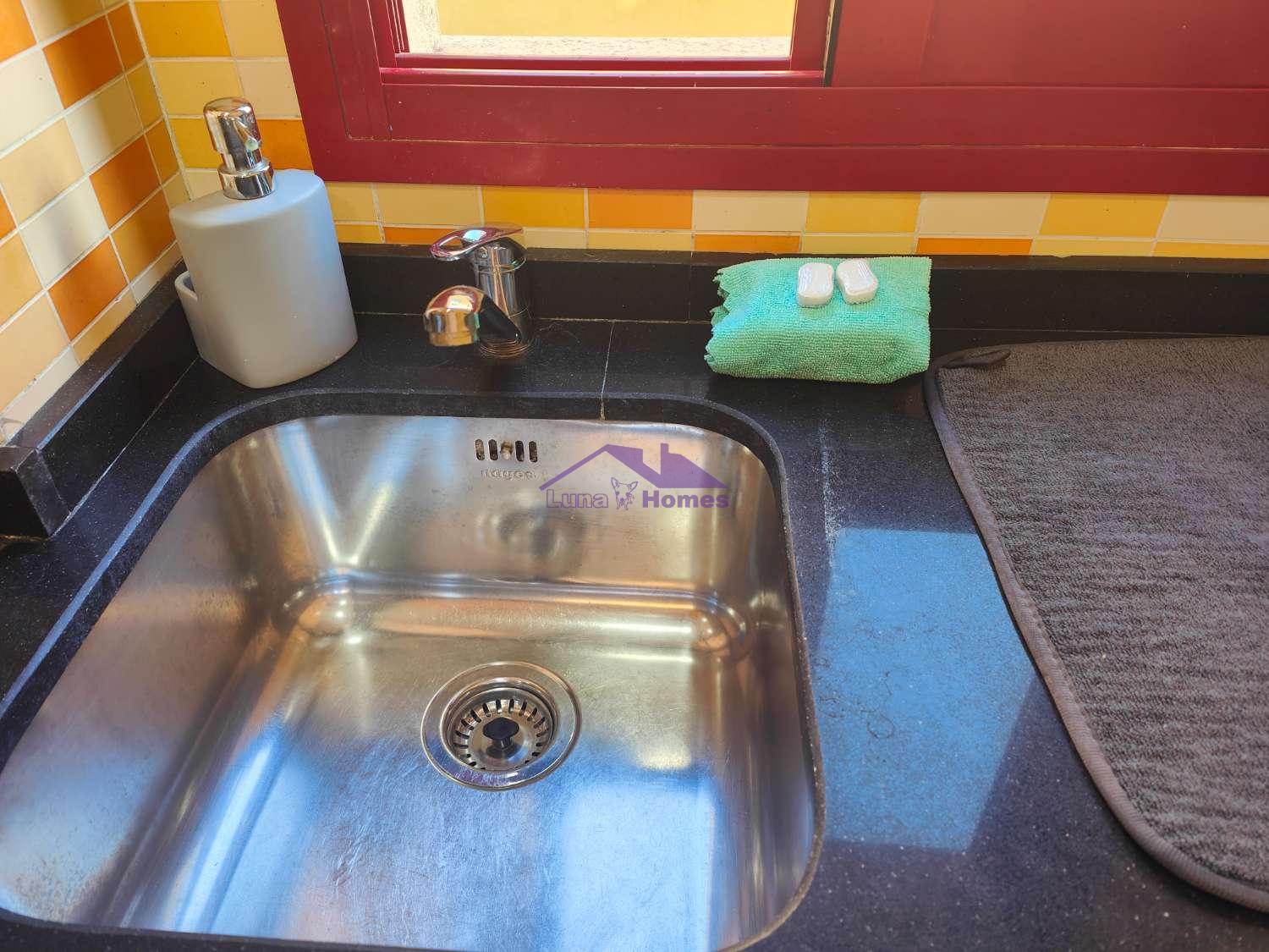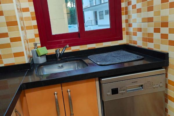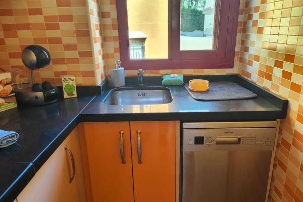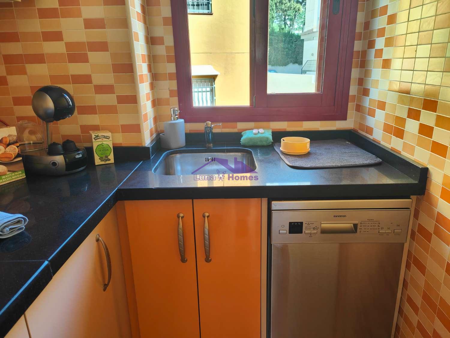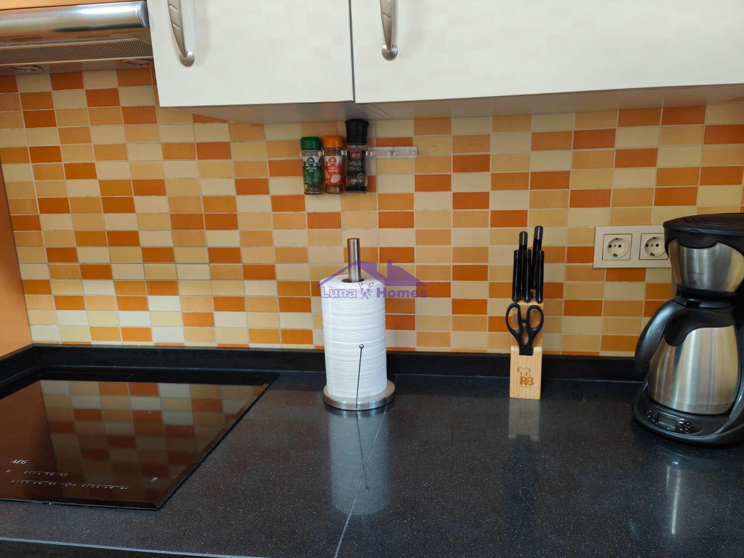 La cocina, totalmente amueblada y equipada con electrodomésticos de alta gama, incluyendo un práctico lavavajillas, es el espacio ideal para disfrutar de tus recetas favoritas sin preocupaciones.