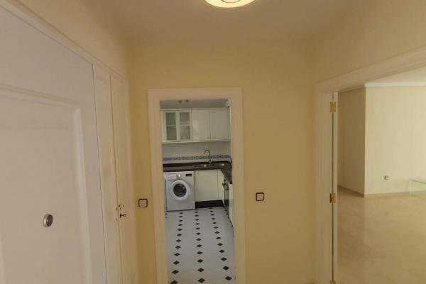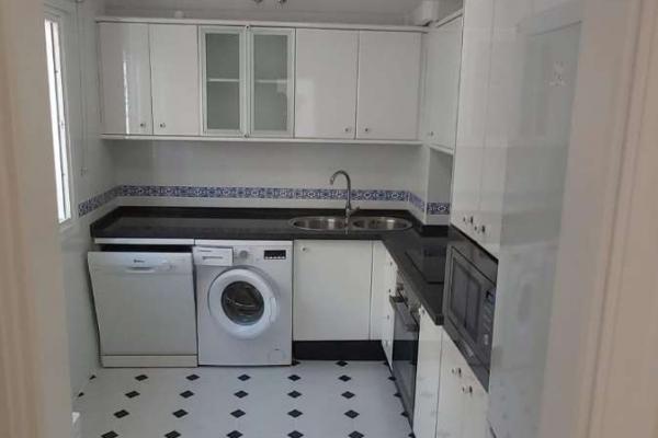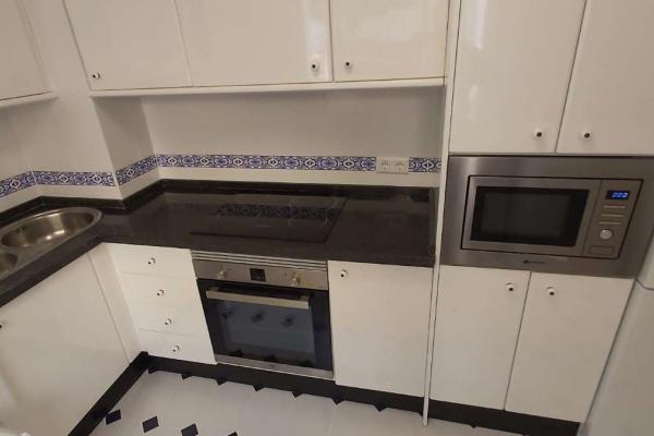 Cocina de Diseño: Totalmente amueblada con modernos armarios blancos brillantes, encimera oscura y equipada con electrodomésticos (incluidos horno, microondas, frigorífico, lavavajillas y lavadora). El distintivo suelo de baldosas blancas y negras le da un toque especial.